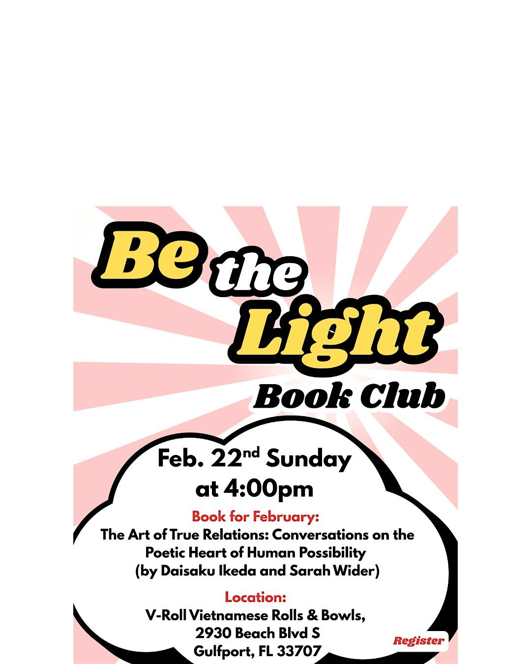 We will meet every 4th Sunday at 4:00pm at V-Roll Vietnamese Rolls & Bowls in Gulfport, FL (located in the southwest St.Petersburg area). They have outdoor seating and delicious fast-casual Vietnamese food and drinks, for anyone who wants to partake in refreshments while we meet.