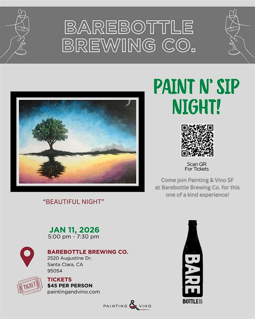 Join us for a fun-filled evening of creativity and relaxation at Barebottle Brewing Co. in Santa Clara! Whether you're a pro or just want to try something new, this in-person Paint and Sip event is perfect for letting your artistic side shine. Bring your friends, enjoy great brews, and paint your way to a Beautiful Night you'll remember. See you there!