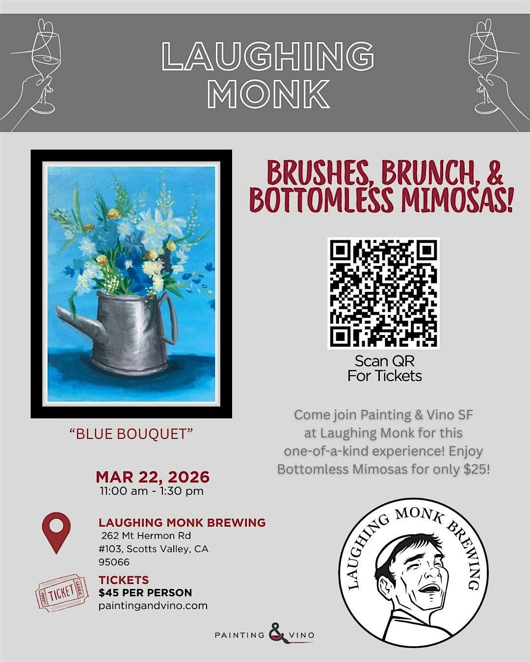 Join us in person for a fun-filled day at Laughing Monk SV! Get creative with your brushes as you paint the stunning "Blue Bouquet," all while enjoying a delicious brunch and endless bottomless mimosas. It's the perfect chance to relax, laugh, and make some colorful memories with friends. Don't miss out on this awesome combo of art, food, and good vibes!
