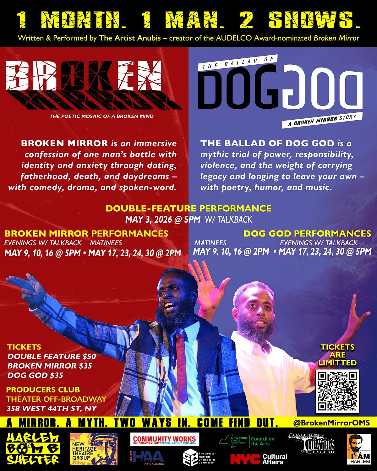 This May, New Heritage Theatre Group, in association with Community Works NYC, is presenting a rare dual theatrical offering: two original, full-length spoken-word one-man shows — Broken Mirror and The Ballad of Dog God — staged across Off-Broadway venues as a limited cultural event.