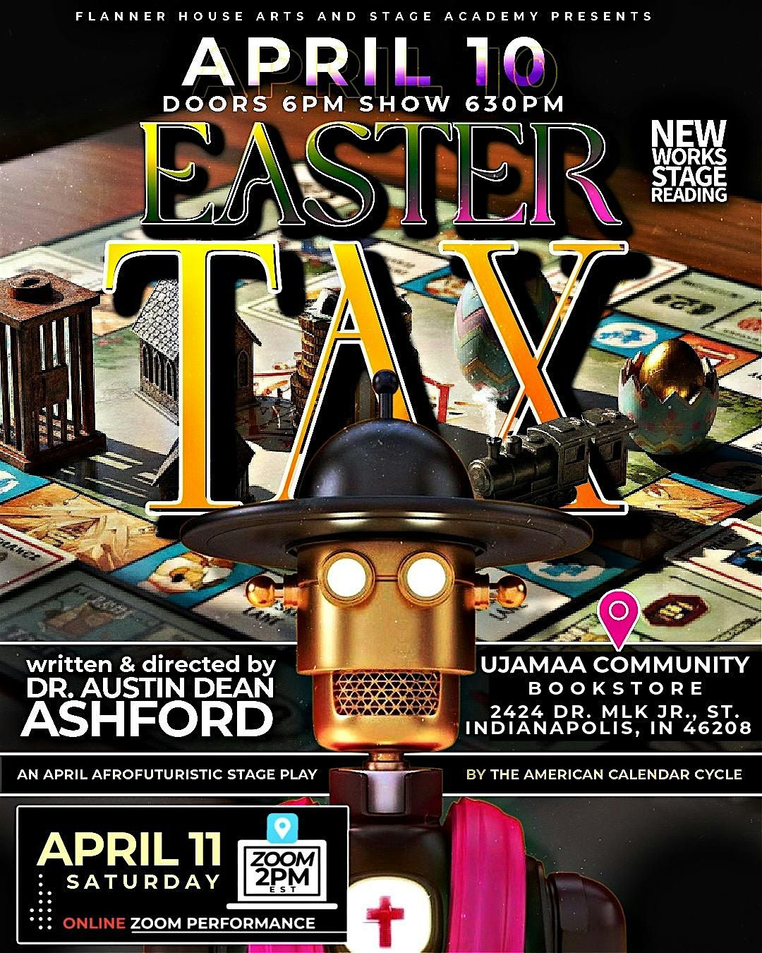 Join us for a developmental staged reading of EASTER TAX, a brand-new Afrofuturistic April play written and directed by Dr. Austin Dean Ashford as part of The American Calendar Cycle.