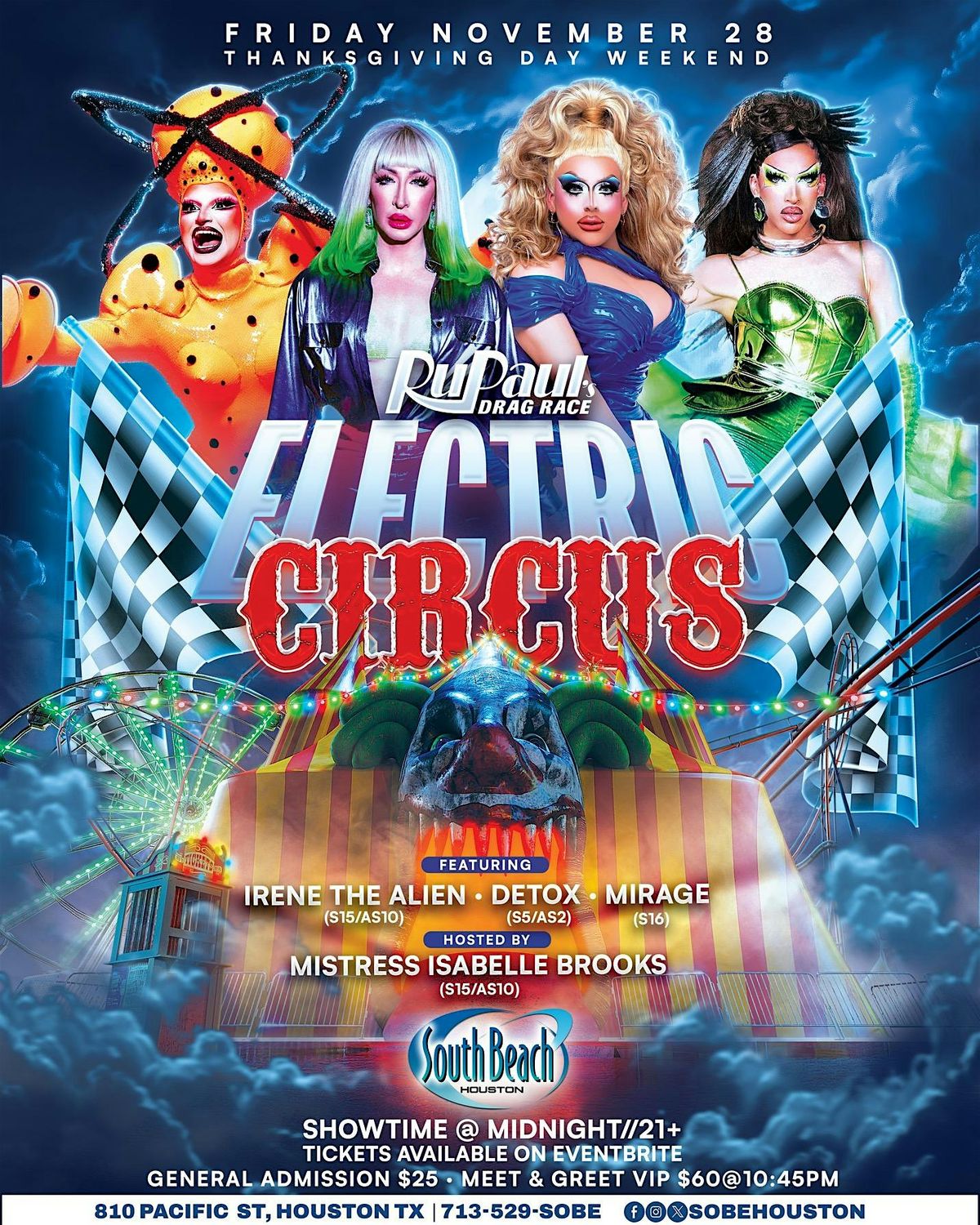 Join us for an unforgettable night at "Electric Circus" featuring Drag Race Royalty; Detox (RuPaul's Drag Race Season 5 & All Stars 2), Mirage (Rupaul's Drag Race Season 16), and Irene The Alien (RuPaul's Drag Race Season 15 & All Stars 10)!