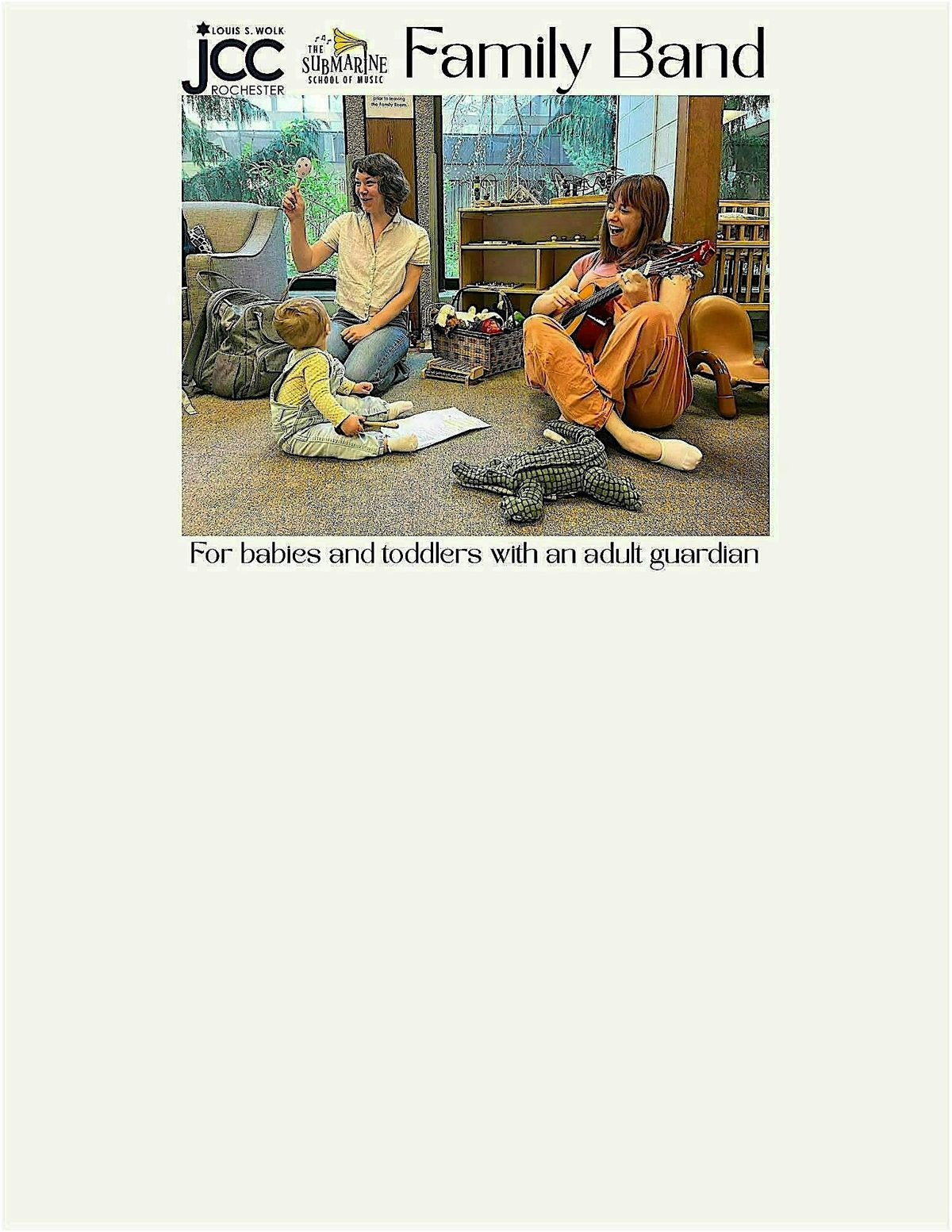 Our Family Band group classes are for children aged birth to 3, accompanied by an adult. Family Band brings a smart and silly, educational and entertaining, insightful and playful way to introduce music and movement at an early age. We have two classes that are Saturday mornings 9:30-10 and 11-11:30.