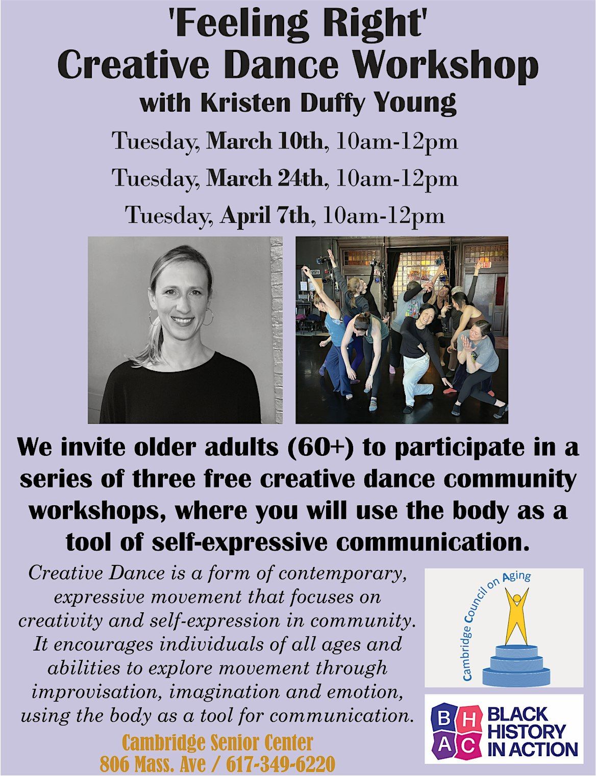 We invite older adults (60+) to participate in a series of three free creative dance community workshops, where you will use the body as a tool of self-expressive communication.