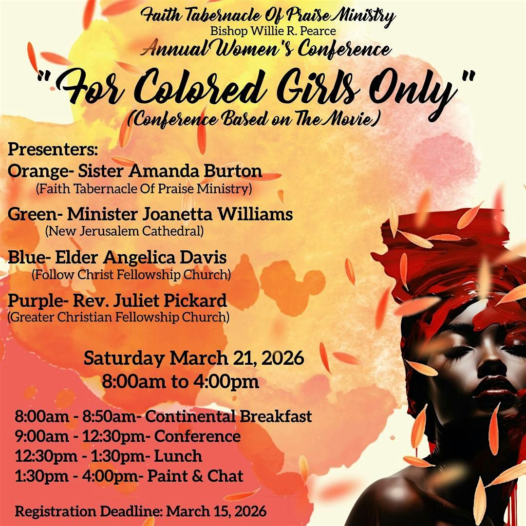 Welcome to the FTOP 2nd Annual Women's Conference "For Colored Girls Only"! Join us at Faith Tabernacle of Praise Ministry on March 21, 2026 at 8:00 AM (Eastern Time) for an empowering day dedicated to emotions and strength. Let's come together to celebrate our uniqueness, share our stories, and uplift each other. Get ready for inspiring speakers, engaging workshops, and meaningful connections. Don't miss out on this incredible opportunity to connect with like-minded individuals and embrace your identity. Mark your calendars and be part of this unforgettable experience!