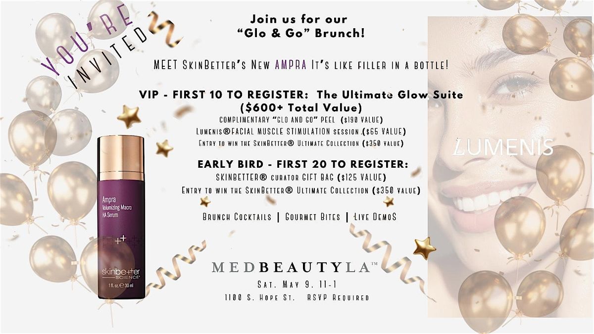 Join us for a fun and casual morning at the "Glo and Go" Brunch! It’s all about good vibes, good food and exciting new products and services, and a free gift with product purchase from SkinBetter®. The first 10 to register will get a complimentary "Glo and Go" professional peel and the first 20 get gift bags with AMPRA®, the newest product from SkinBetter®