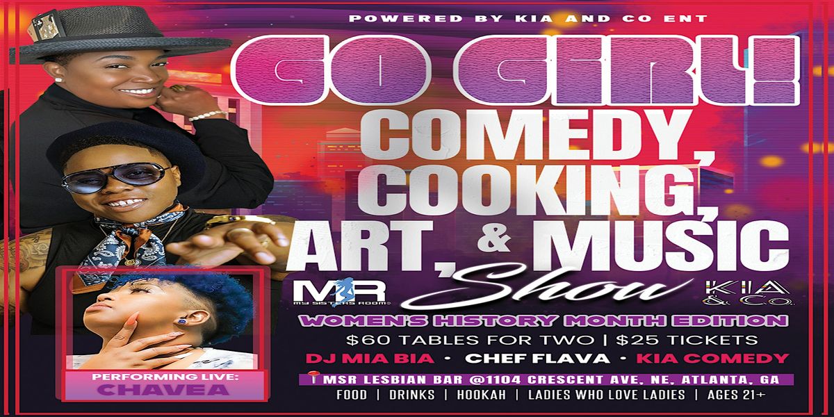 Ladies, join us this Women's History Month at "Go Girl," a curated evening centered in and celebrating women! Kia and Co. is bringing flavor, soul, and standup to the stage for one night only! Three dynamic talents collide for this cooking, comedy, art, and live music show! Flava is cooking and painting on stage, with Chavea and Kia each performing live and Dj Mia Bia on the 1's and 2's! Entry is only $25, and your ticket includes freshly prepared bites by Flava and FREE entry to the Fem Friday After Party! Bring your boo, come with your crew, or even just YOU! This grown and sexy event takes place at the only Lesbian lounge in the Southeast, My Sister’s Room! Come for the show, and stay for the Fem Fridays ATL AFTER PARTY! We have $50 bottles of champagne available for preorder. Meet us in Midtown, where it all goes down on the Final Friday of Women's History Month, March 27th at MSR!