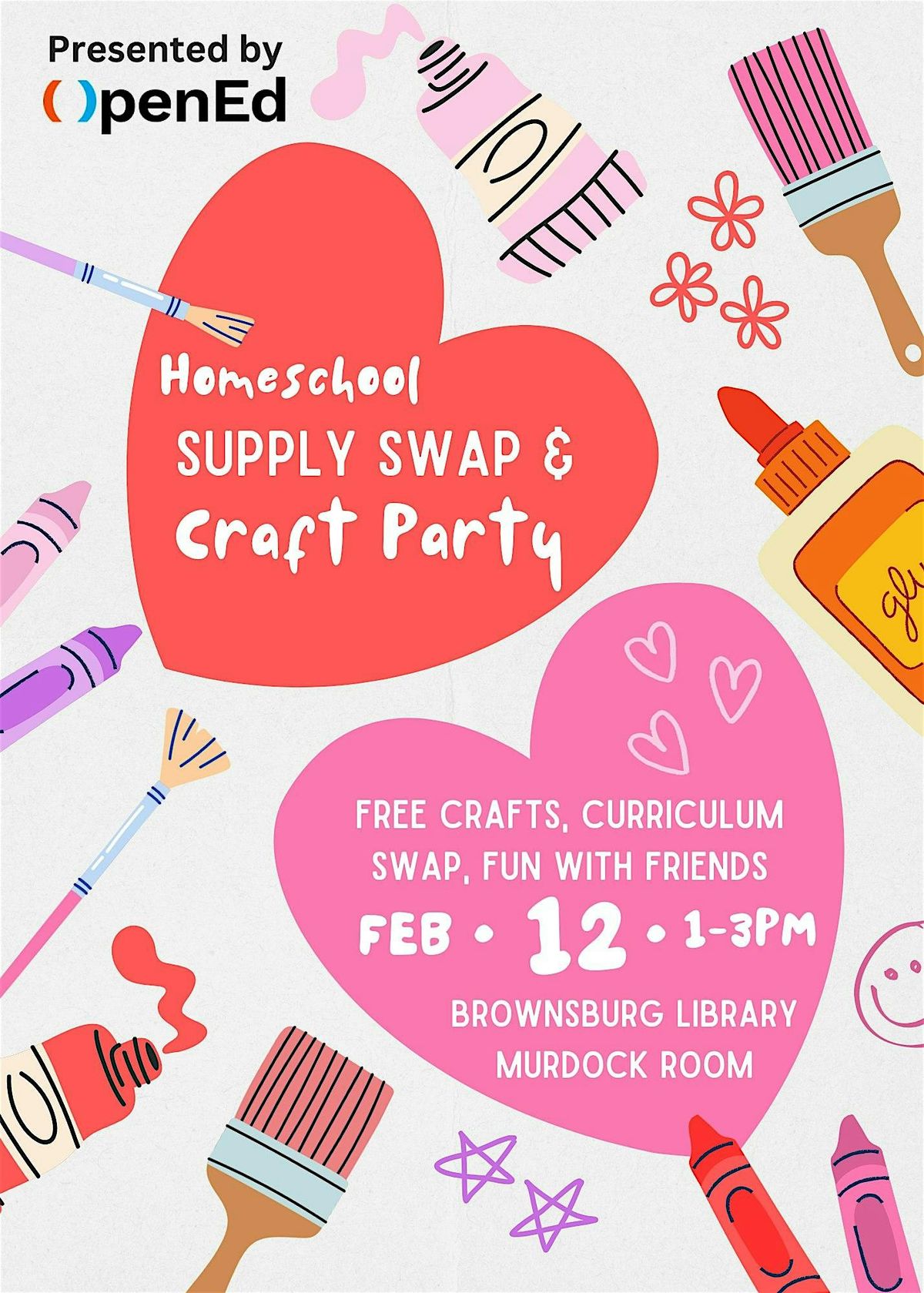 Don't have anything to swap? That's OK! Join us for a "crafternoon" of making with a little Valentine's Day themed art and making! There will be a raffle for OpenEd swag, and a Parent Liaison on site to answer all your questions. Bring the kids to play and share the love (don't we all LOVE a fresh workbook!?)