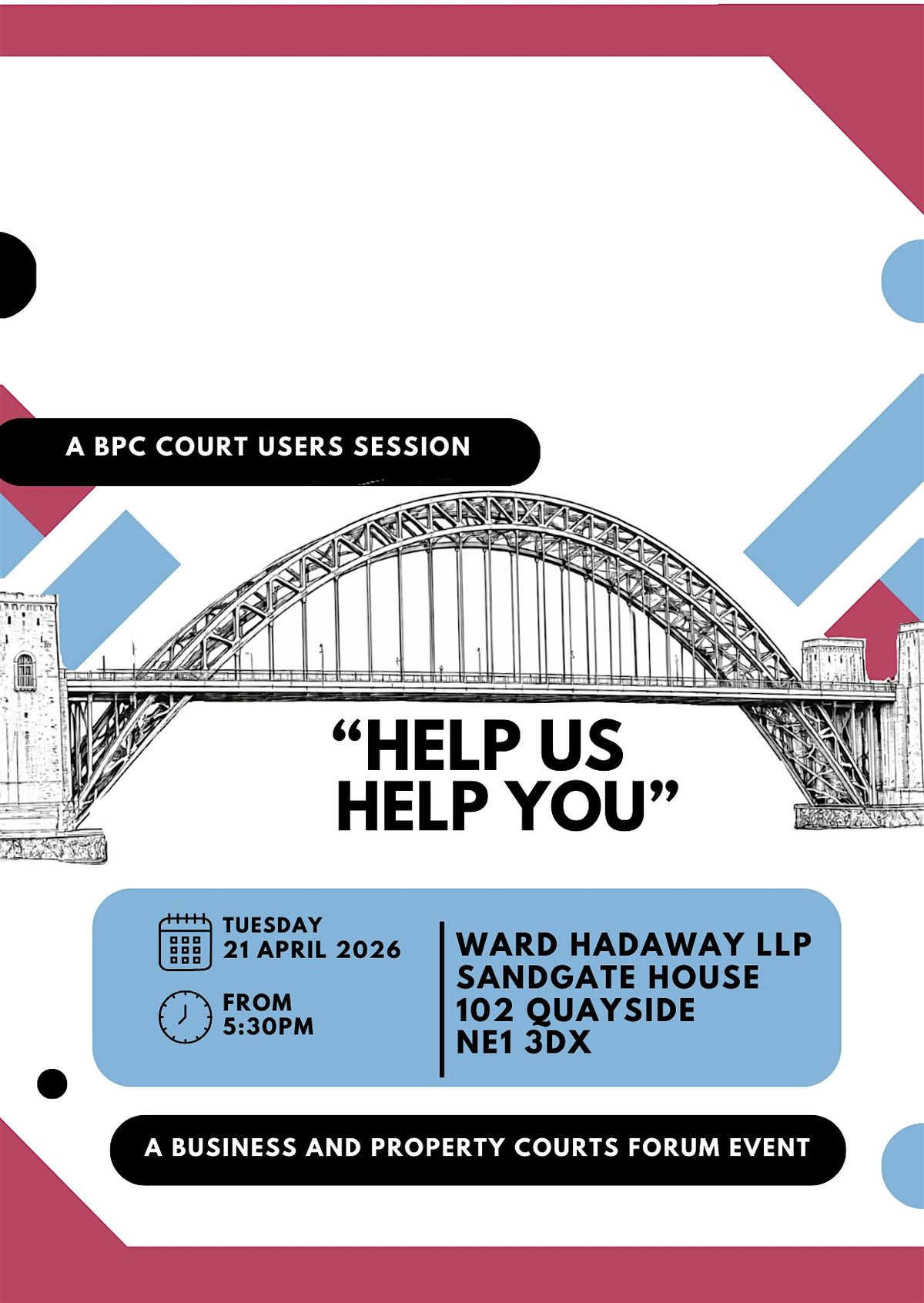 The Newcastle Business and Property Courts Forum are pleased to invite you to our upcoming seminar, “Help Us, Help You” taking place on Tuesday 21 April from 5.30 pm and kindly hosted by Ward Hadaway LLP at Sandgate House, 102 Quayside, NE1 3DX.