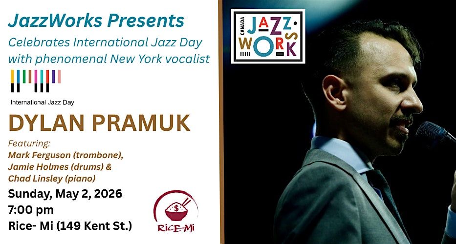 JazzWorks Canada celebrates International Jazz Day with a special "JazzWorks Presents" concert starring phenomenal New York vocalist DYLAN PRAMUK. Join us for a fantastic evening of Dylan Pramuk’s vocal prowess on jazz standards and stunning original works. Also featuring: Mark Ferguson (trombone), Jamie Holmes (drums) & Chad Linsley (piano)