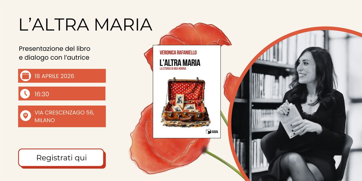 Il 18 aprile, presso la Biblioteca di quartiere LeggerMente al Sorriso, avrai l’occasione di vivere questa esperienza speciale, durante la presentazione del libro di Veronica Rafaniello, L’altra Maria, che racconta la vita (stra)ordinaria di sua nonna.