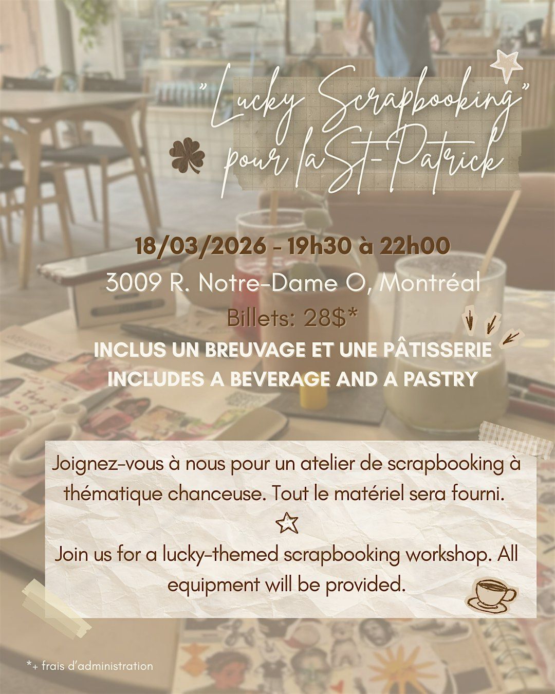 Viens passer une soirée super sympa au Velora Café pour notre atelier Lucky Scrapbooking ! C’est l’occasion parfaite pour créer des "visionboards", des listes de souhaits, etc. Laisse ta créativité prendre le dessus!