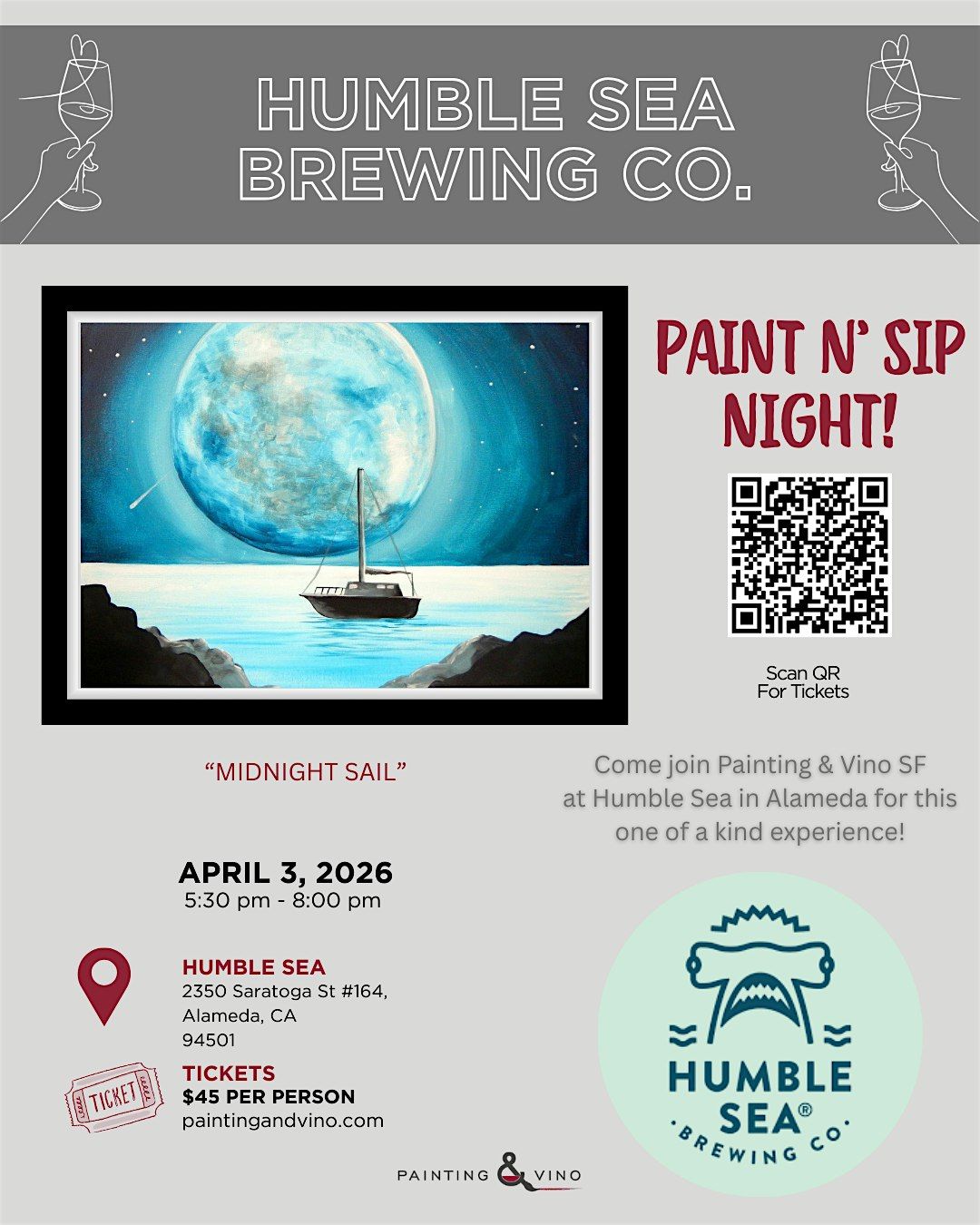Get ready for a fun-filled evening of creativity and chill vibes! Join us in person for the "Midnight Sail" paint and sip night at Humble Sea Alameda. Perfect for all skill levels, you'll enjoy sipping your favorite drink while creating a beautiful sailing-inspired masterpiece. It's all about good company, great art, and a relaxed atmosphere. Don't miss out on this awesome night—see you there!