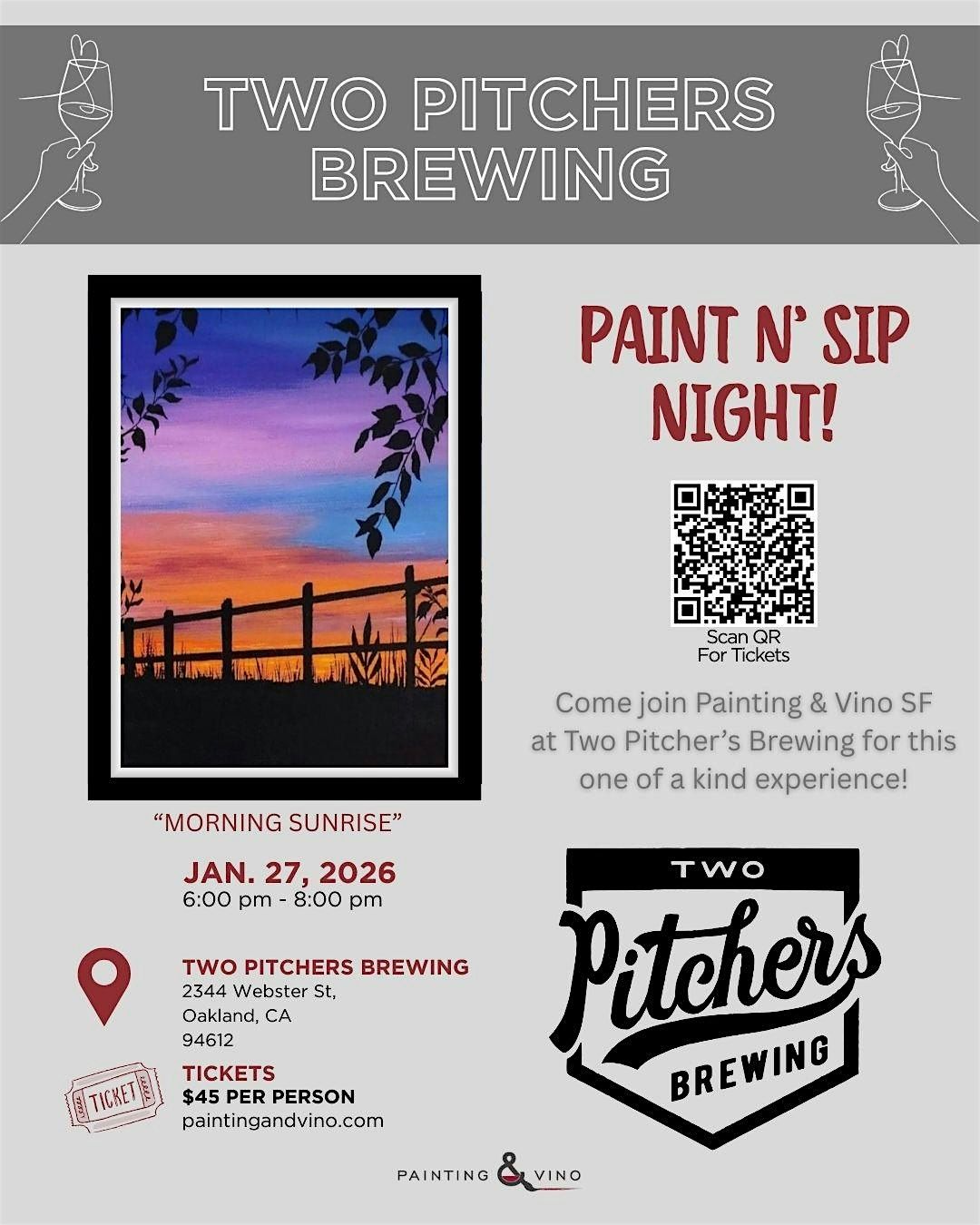 Kickstart your day with some creative vibes at Two Pitcher's Brewing in Oakland. This in-person event is the perfect blend of painting and sipping your favorite brew. Whether you're a pro or just looking to have some fun, come enjoy a relaxed atmosphere, great company, and your own canvas to bring the morning sunrise to life. Don’t miss out on this chill and artsy hangout!