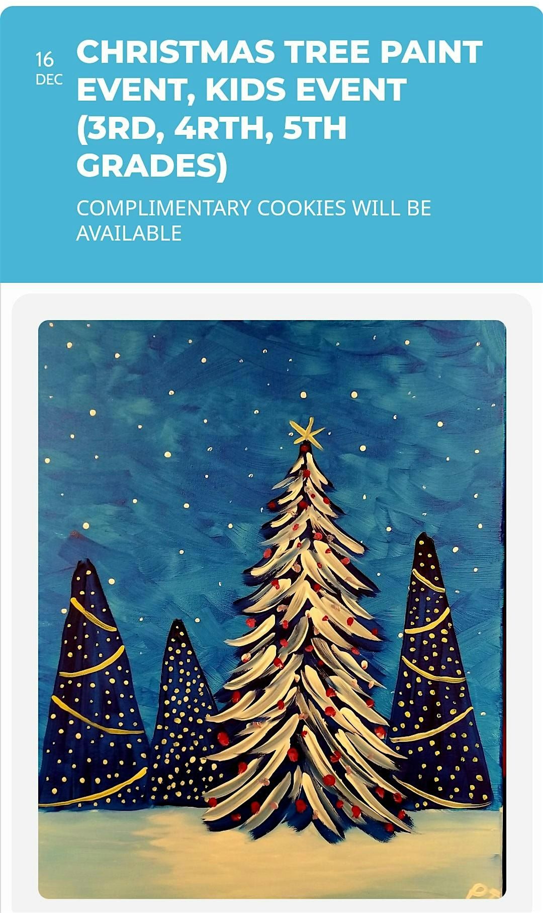Get ready for a fun-filled In-Person painting party! Whether you're an adult or a kid, join us to create your very own festive Christmas Tree masterpiece. No experience needed – just bring your holiday cheer and creativity! It’s a perfect chance to unwind, laugh, and make some colorful memories together. Don’t miss out on this awesome seasonal event where art meets holiday spirit!