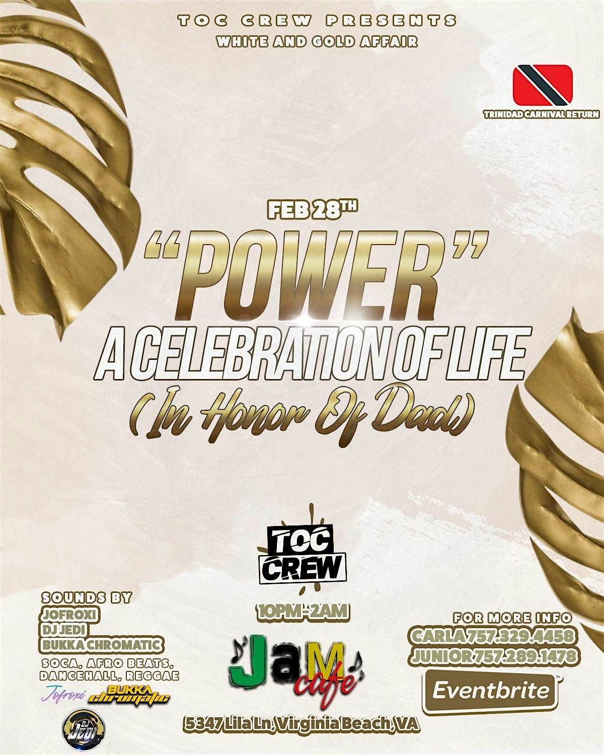 Welcome to POWER A Celebration of Life (In Honor of Dad) / Trinidad Carnival Return at JAM Cafe!