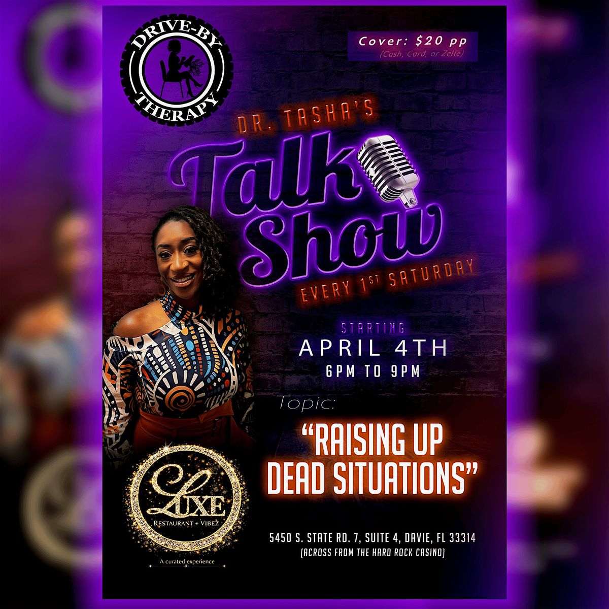 Come and experience a Talk Show in real time. Dr. Tasha has combined mental health & laughter for 10 years. Across from the Hard Rock Casino