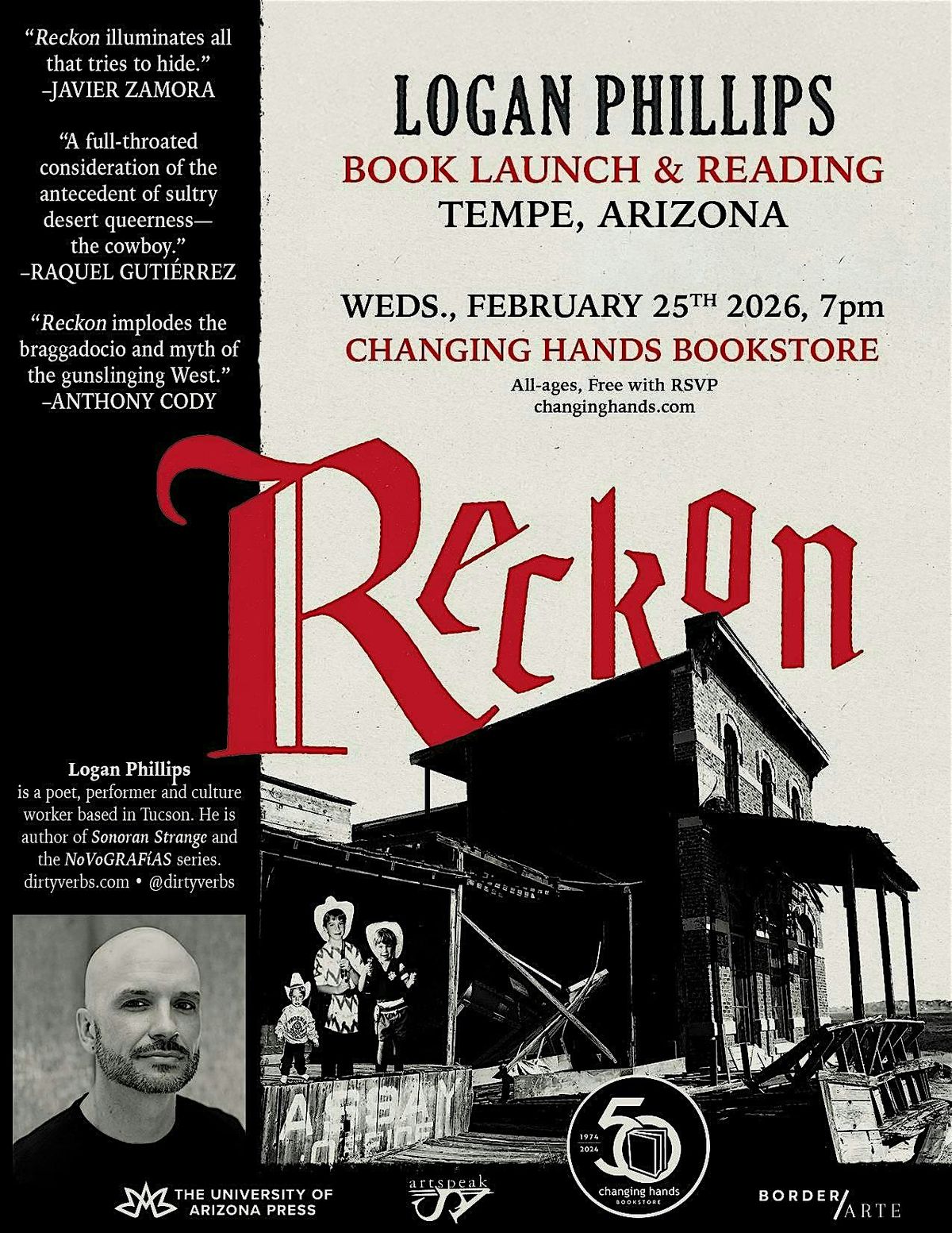 In Reckon (2026), artist and poet Logan Phillips returns to the fabled site of his childhood to confront the frontier stories he inherited as a boy: gunfights, outlaws, Hollywood cowboys, and the racial and gendered power structures that sustained them. This hybrid memoir blends essays, photography, poetry, newspaper clippings, and screenplay fragments to examine sexuality, masculinity, parenting, and the contradictions of loving a landscape built on erasure and “slathered in M**der. ” Moving through the Tombstone of the 1980s and 90s, where daily reenactments and museum displays reinforced a nostalgic masculinity, Phillips exposes a history far more complex than the one he was raised on and maps how empire and patriarchy shape belonging, narrative, and American nationhood.