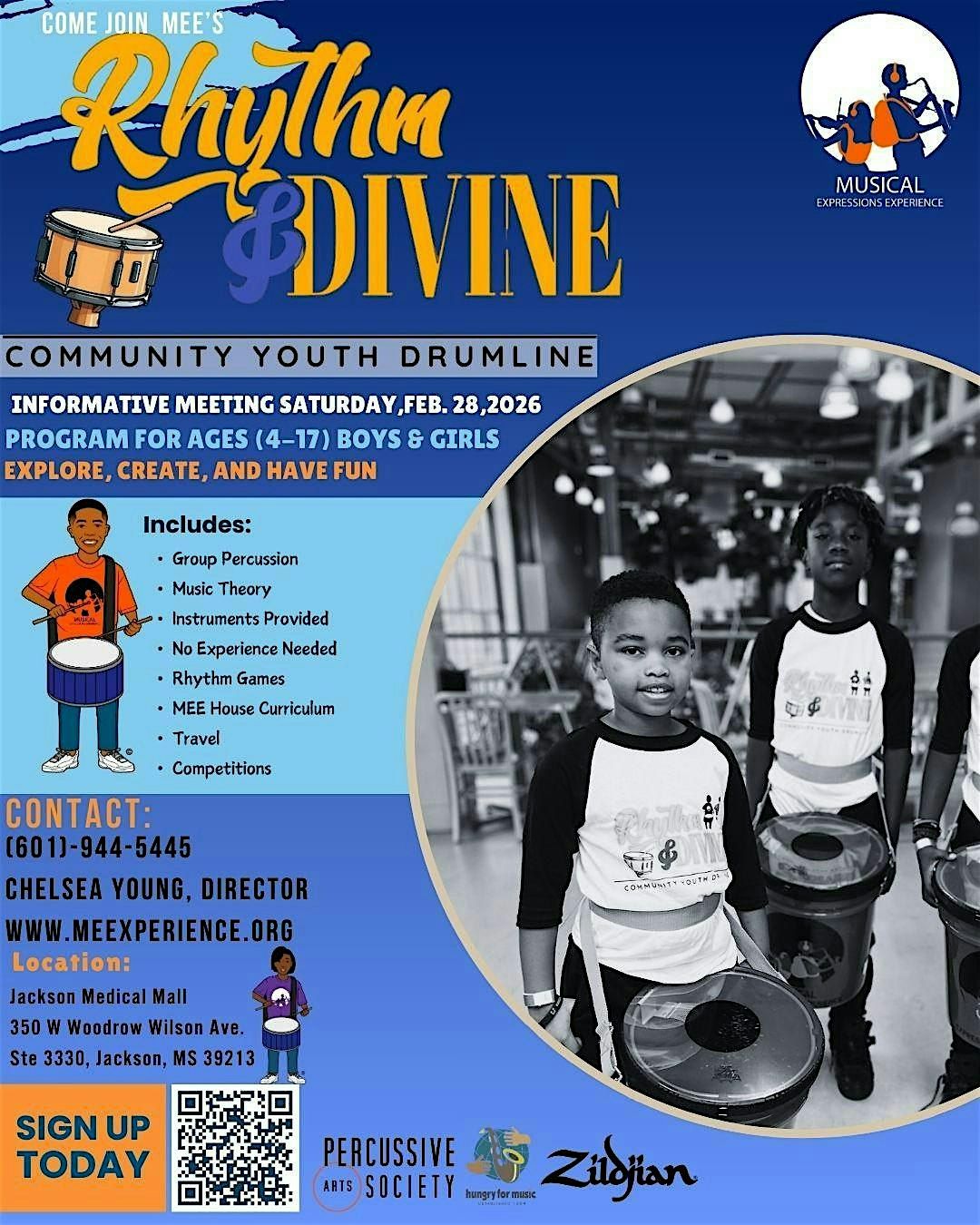 Join us for an in-person informational meeting for the Rhythm & Divine Community Youth Drumline, hosted by Musical Expressions Experience!