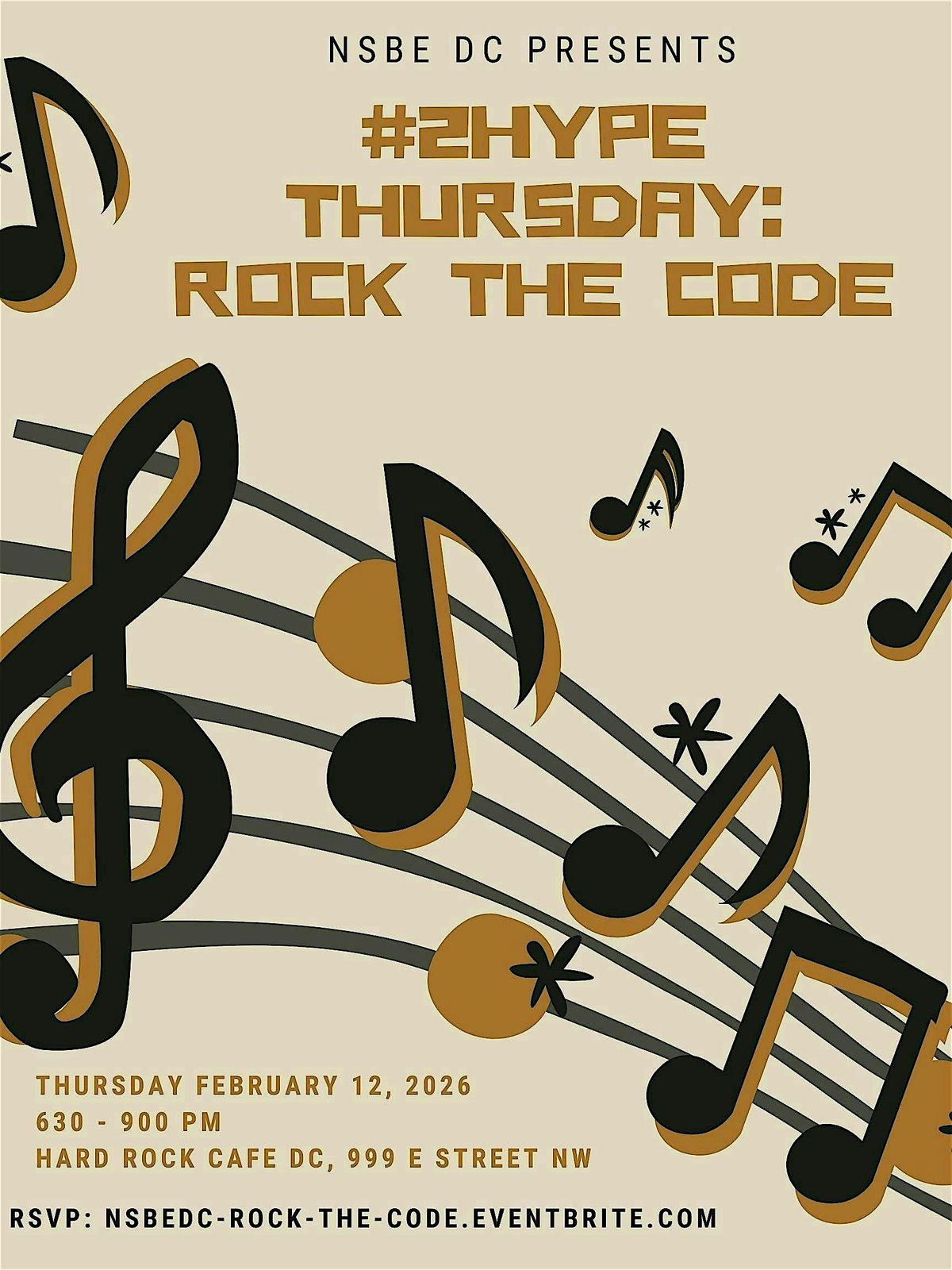 Come join the NSBE DC Family for "Rock the Code": A #2HypeThursday Black History Month Mixer at the iconic Hard Rock Restaurant in downtown DC! We will have our own private room to enjoy each other's company. Heavy food will be provided so come hungry (you can still order from the menu if you like)! Drink tickets also available for purchase!