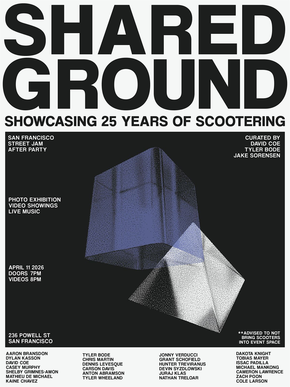 Shared Ground is a community exhibition bringing together photography, art, and moving images that document the freestyle scootering scene across different eras. A curation of work over the past 25+ years. [2000-2025].