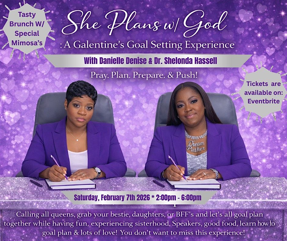 She Plans w/ God is a faith-centered Galentine’s goal-planning experience designed for women who are ready to prepare intentionally for 2026. This powerful brunch gathering brings together motivation, strategy, and sisterhood as women learn how to align their goals with God’s direction. Led by motivational speaker Dr. Shelonda Hassell and credit specialist Danielle Denise, attendees will be guided through purposeful planning, mindset shifts, and financial preparation—because faith without action is incomplete. This is more than goal-setting; it’s about preparing for what you’re praying for, breaking cycles, and pushing forward with clarity, confidence, and God at the center of the plan.