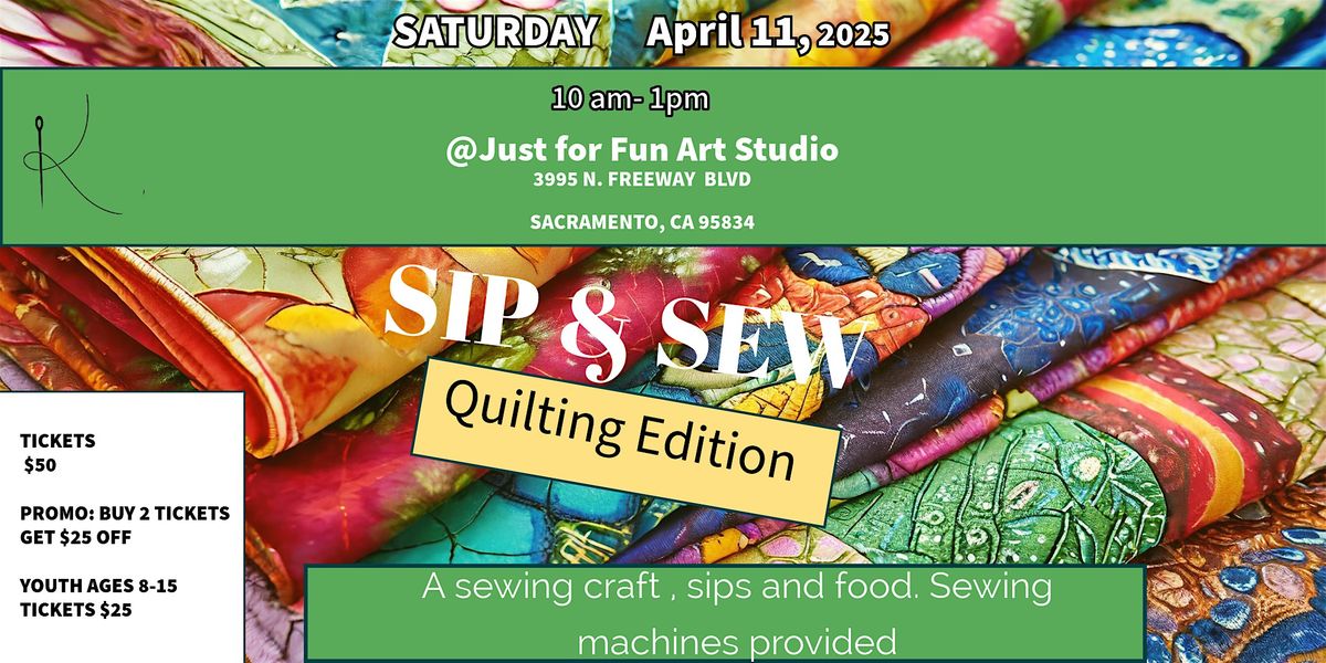 Welcome to Sip & Sew "Legacy Quilting Edition! Join us at 3995 N Freeway Blvd on April 11, 2026 at 10:00 AM (Pacific Time) for a day of quilting fun. Grab your favorite drink, and let's create some beautiful quilts together. No experience necessary, just bring your creativity and enthusiasm. Let's stitch our way to a memorable day! See you there!