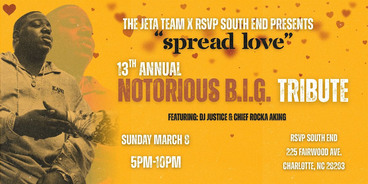 The JETA Team presents..."SPREAD LOVE" 13th Annual Notorious B.I.G. Tribute feat. Soul Brother DJ Justice & Chief Rocka Aking! The JETA Team's B.I.G. Party is the City of Charlotte's ORIGINAL and PREMIER Notorious B.I.G. Tribute! We salute "Brooklyn's Finest" with remixes, originals, collabos, and all things "King of New York" including the music of Craig Mack, Total, The LOX, Carl Thomas, Ma$e, Faith Evans, Loon, G. Dep, 112, Shyne, Mary J. Blige, Black Rob and others! It's a true "Can't stop, Won't stop" party! "This goes out to you, and you, and you, and you!" The Legend of Christopher "B.I.G." Wallace continues! Rock ya Biggie garments, NY fitted hats, DKNY, Timbs, Coogi sweaters and such! "Spread Love it's the Brooklyn Way!"