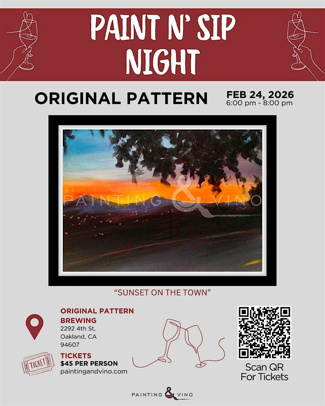 Get ready for an awesome in-person night of creativity and good vibes! Join us at Original Pattern Brewing Co. in Oakland for "Sunset on the Town" Paint and Sip. Bring your friends, grab a drink, and unleash your inner artist while enjoying the cozy brewery atmosphere. No experience needed—just come to have fun, paint, sip, and soak up the sunset magic!