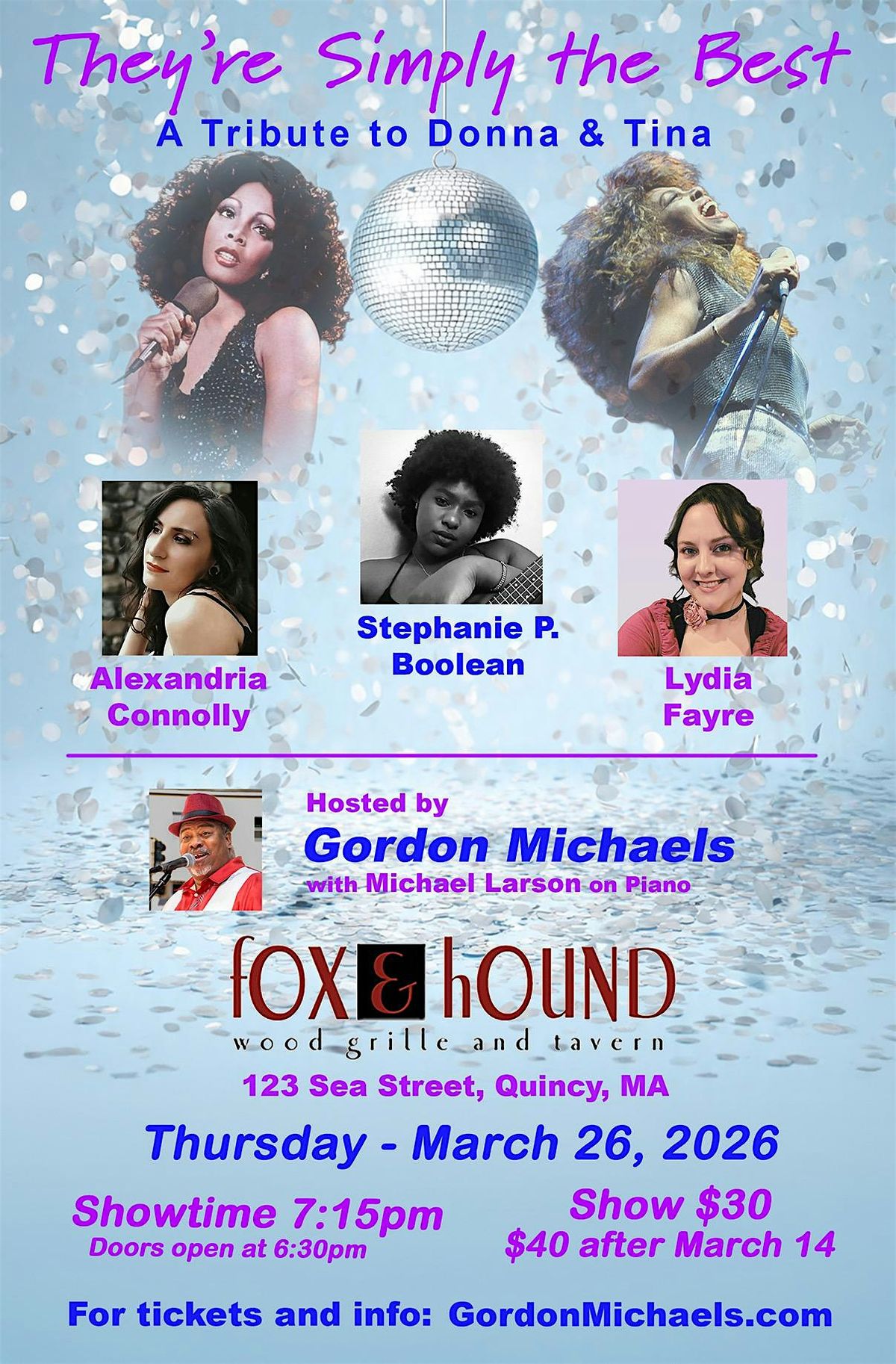 Secure your tickets now for the March 26th show at the Fox and Hound Tavern in Quincy, starting at 7:00 p.m. Visit gordonmichaels.com to get your tickets before the early bird special ends. Witness the captivating performances of Lydia Fayre , Alexandria Connolly, and Stephanie P Boolean, as they come together to pay tribute to these music icons with their unique and melodic voices. Don't miss this opportunity to celebrate Cabaret Month and honor the legacy of Donna Summer and Tina Turner.