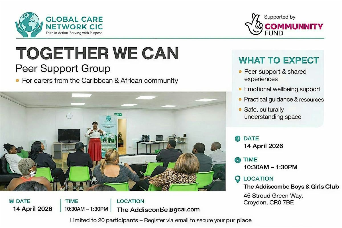 Info: Caring for others can be rewarding, but it can also feel overwhelming, isolating and exhausting. You don't have to carry it alone. Global Care Network CIC invites you to "Together We Can" a safe, welcoming and culturally aware space design for carers of Caribbean and African decent to connect, share and receive the support they deserve. This group is for Unpaid carers, family carers, Individuals supporting loved ones with disabilities, neurological conditions or long term- illness and Anyone feeling emotionally, mentally, or physically stretched by caring responsibilities. What to expect a Warm Welcome & introduction, A culturally Safe space guidelines & Confidentiality, Real conversations and shared experiences, Guided peer support discussions, Wellbeing activities and reflection, signposting to support services, Time to connect and build community, Refreshments. You will gain Emotional & peer support from people who understand, A chance to reconnect with yourself not just your role