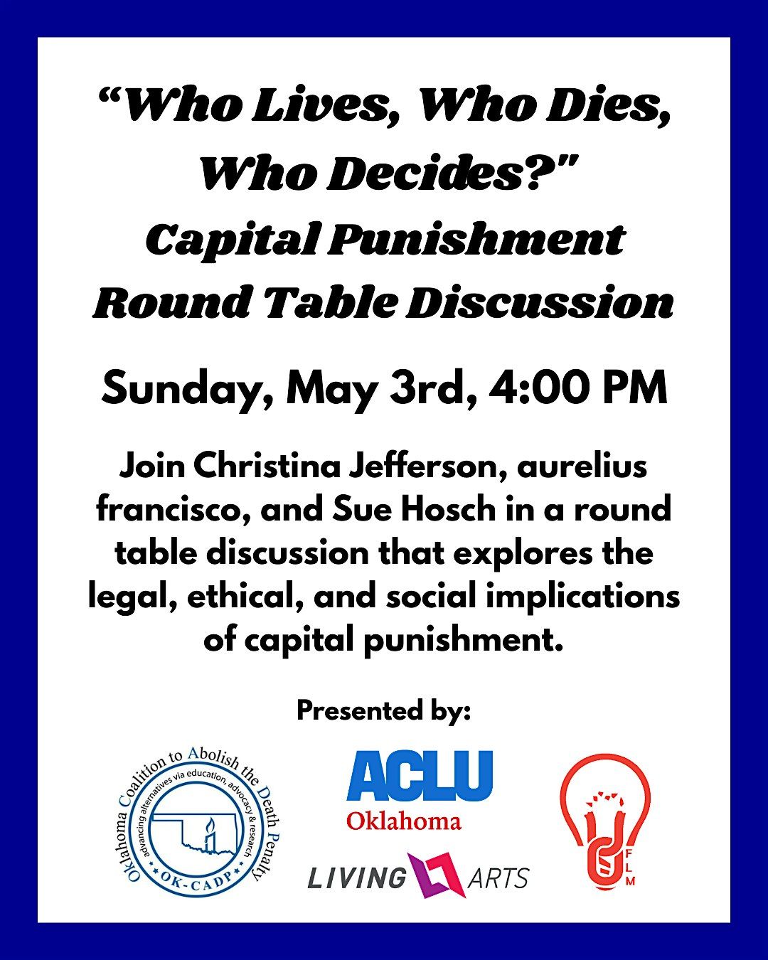 This round table discussion is held in direct conjunction with our exhibition, “Who Lives, Who Dies, Who Decides.” Attendees are encouraged to arrive early or stay late to view the exhibition, as the artwork provides a context for the issues being discussed by our panel. The exhibition and the discussion collectively seek to engage the community in a deeper examination of justice, morality, and the state's ultimate power.