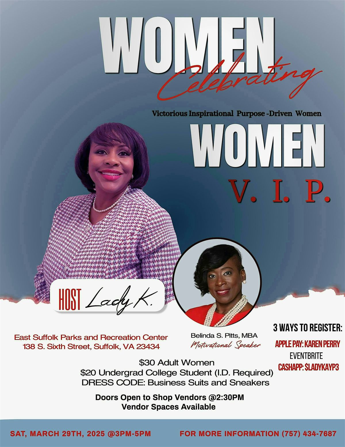 Come join us for a fabulous afternoon of Networking, Empowerment, and Celebration! This event is all about Women Celebrating Women in their personal and professional lives. Connect with like-minded individuals, share experiences, and build lasting relationships. Whether you're a seasoned professional, retired or just starting out, this event is for you! Don't miss this opportunity to be inspired, uplifted, and surrounded by amazing women just like you. Let's celebrate each other's successes and lift each other up to new heights. Proceeds will be made to Suffolk's Salvation Army and Lady Kay's Women's Group.