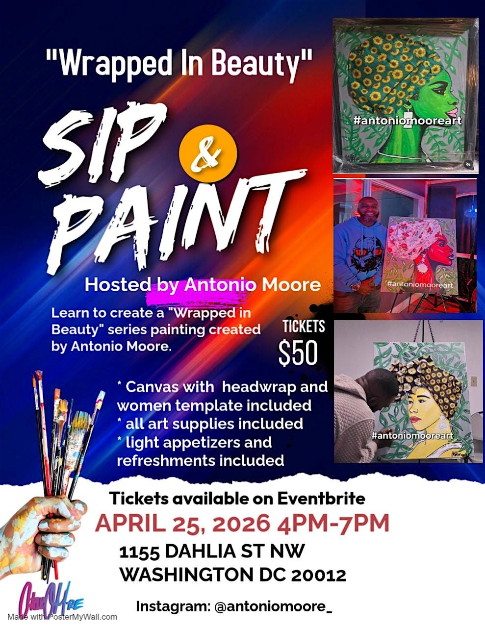 Learn to paint Antonio Moore's Wrapped in Beauty series. Led by Antonio, all attendees will receive canvas with real headwraps on the canvas