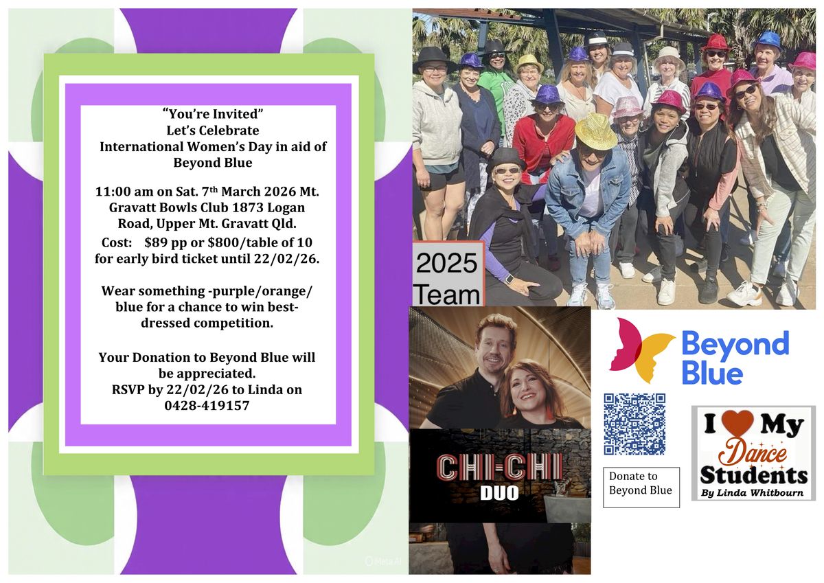 "You're cordially Invited" to join us to Int’l Women’s Day 2026 luncheon in aid of Beyond Blue https://www.beyondblue.org.au/ ANNUAL CHARITY LUNCH & Entertainment - 7th March 2026 - 11:00 am at Mt. Gravatt Bowls Club - 1873 Logan Road, Upper Mt. Gravatt.