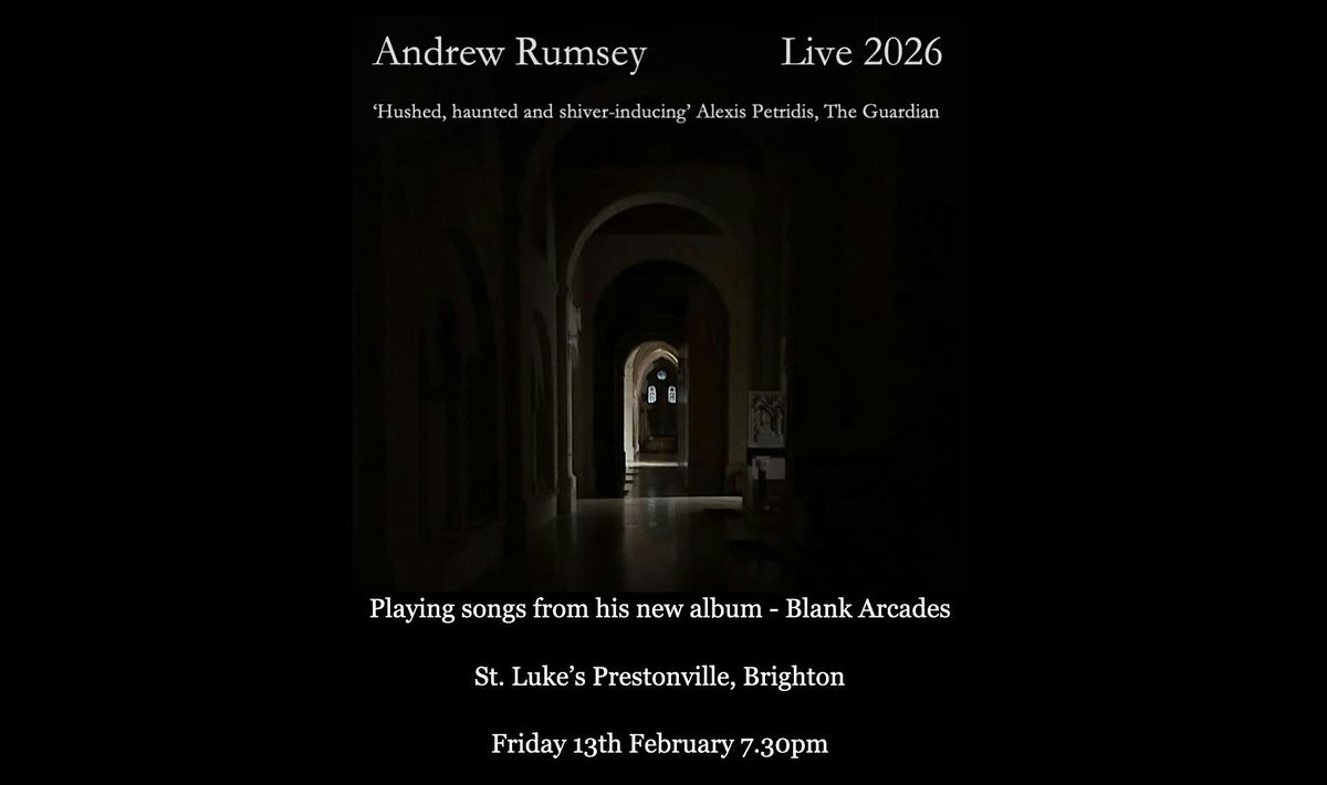 Andrew Rumsey and guitarist Dave Perry will debut new songs in their signature contemporary folk style described by Alexis Petridis of The Guardian as "hushed, haunted and shiver-inducing". The evening will include free refreshments and some Q&A about songwriting, music, place and faith in a relaxed cafe style environment.