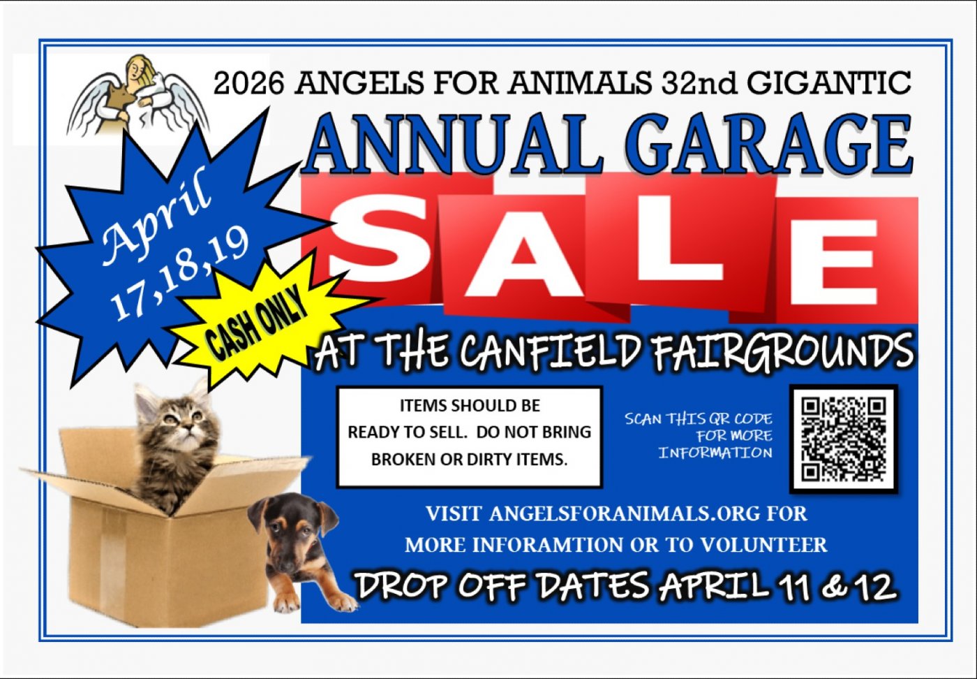 Angels for Animals Gigantic Garage Sale is a community garage sale held to support Angels for Animals. Donations can be brought to the Canfield Fairgrounds on Saturday, April 11 and Sunday April 12 from 9:00 am - 4 :00 pm. The sale begins Friday, April 17 with the Early Bird from 9 am - 12 pm, cost $10. Noon - 5 p.m. - Cost: $3. Saturday, April 18, 10 am - 5 pm - Cost $3. Sunday, April 19, 10 a.m. - 2 pm - Free. 2:15 p.m. - 4 pm - $20 Truckload Sale. 8 Building Filled with unique treasures and items donated from the community to support our furry friends at Angels for Animals.