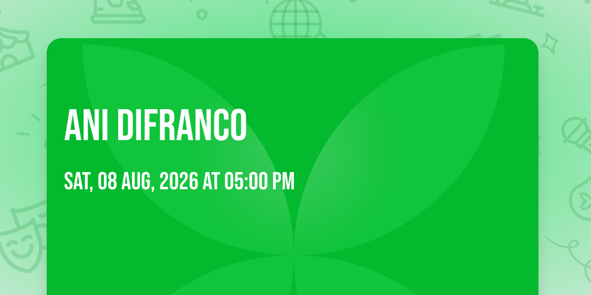 🎉 Welcome to Ani DiFranco, where dreams come alive and possibilities are endless! 🏛️ Join us at Red Butte Garden in the heart of Salt Lake City, UT for an event that defies expectations. 📅 On August 8th, 2026 at 05:00 PM, be part of something truly extraordinary as we bring together innovation, entertainment, and pure magic. ✨ Every aspect has been carefully designed to ensure an unforgettable experience for all our guests. Whether you're seeking adventure, inspiration, or simply a break from the ordinary, this event promises to deliver beyond your wildest dreams. 🎊 Prepare for a journey into the extraordinary!http://maps.seatics.com/GeneralAdmissionEvent_2018-06-27_1649_SVGC_tn.gif