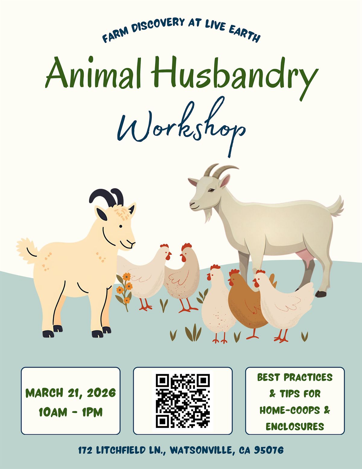 Learn the essentials of animal husbandry in this hands-on workshop designed for home & small-scale keepers. Participants will explore best practices for caring for animals, including chickens, goats, and other small livestock, with a focus on creating healthy, safe, and comfortable coops and enclosures. The workshop covers practical topics such as proper feeding, housing design, sanitation, disease prevention, and enrichment, as well as tips for monitoring animal health and behavior.