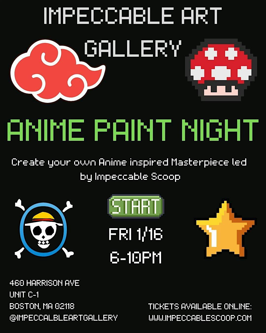 Create your own Anime inspired Masterpiece led by Impeccable Scoop. 8x10 canvas and refreshments provided.About this Event