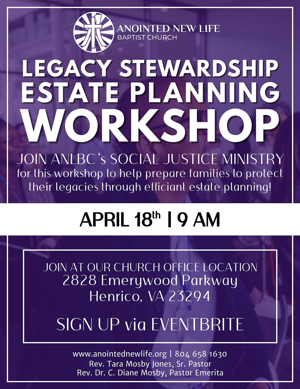 Join us on April 18, 2026, at 9:00 AM (Eastern Daylight Time) for an informative session at ANLBC's Office Location: 2828 Emerywood Parkway. This workshop is all about helping you understand estate planning and how to leave a meaningful legacy for your family. Whether you're new to this or just want to learn more, come connect. See you there!