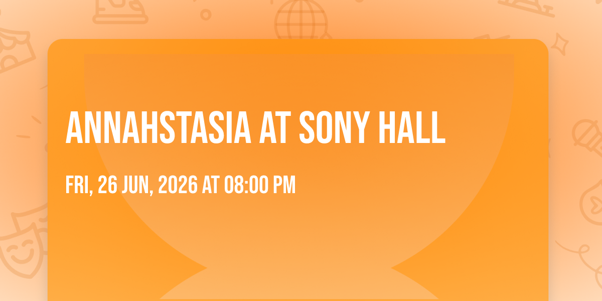 🌟 Be part of history at Annahstasia at Sony Hall, an extraordinary gathering that will captivate your imagination! 🏛️ The prestigious Sony Hall in New York, NY sets the stage for an unforgettable experience on June 26th, 2026 at 08:00 PM. ✨ They are bringing together the finest elements of entertainment and innovation to create moments that will take your breath away. From the moment you arrive, you'll be immersed in an atmosphere of wonder and excitement. 🎯 This carefully planned event ensures every guest experiences something truly special. 🎊 Early booking is recommended for this must-attend event of the season!