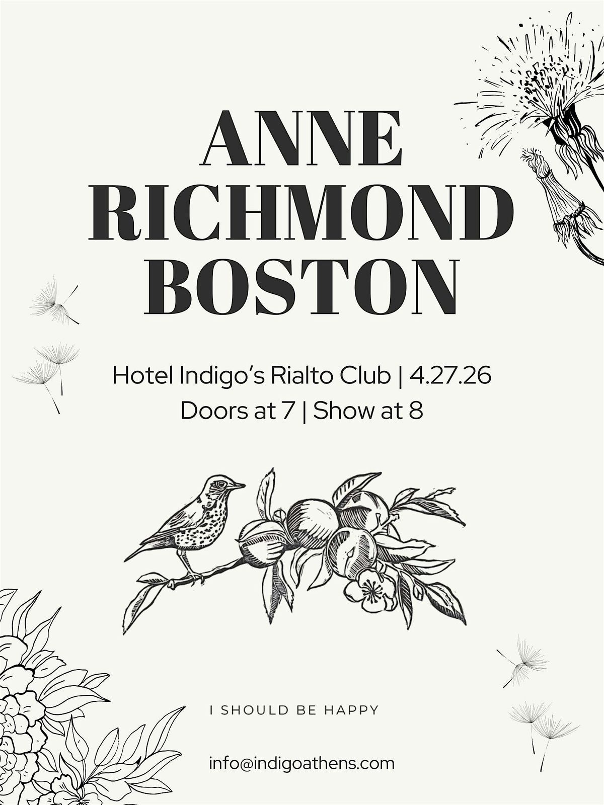 Anne Richmond Boston brings her long-awaited solo work to the Rialto Club at Hotel Indigo Athens on April 27. Best known for her work with The Swimming Pool Qβs, Anne will perform songs from her recently released, long-lost album I Should Be Happy, originally recorded in the 1990s and finally released in 2025.