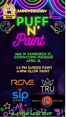 Celebrating our 3rd year of Puff n' paints! whoot whoot ! Whether you're a pro or it's first time picking up a brush your sure to take home a master piece every time! Bring a friend or come alone either way your have a great evening getting creative and trying out some samples provided by sponsers. Everything is always provided from Art supplies, munchies/pizza, mocktails, an actual goodie bag, flower bar, and a ticket to the raffles we do during the event. All attendees get a MVP card loaded with discounts for all upcoming events We have local vendors on site and music to set the atmosphere. Must be 21+