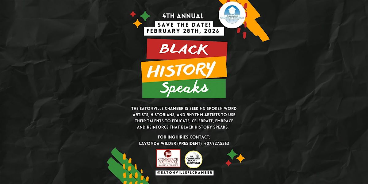 The Eatonville Chamber is seeking Spoken Word Artists, Historians, and Rhythm Artists willing to use their talents to educate, celebrate, embrace and reinforce that Black History Speaks.