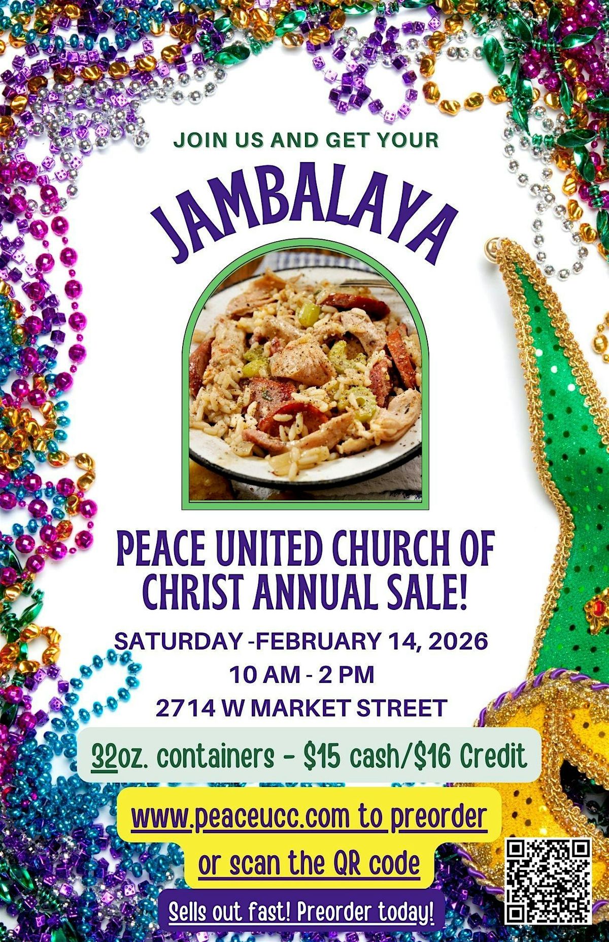 Taking preorders now through February 13th. Call the church at 336-299-8663, visit our website www.peace.ucc.com or online via the link below. You can also scan the QR code on the flyer.