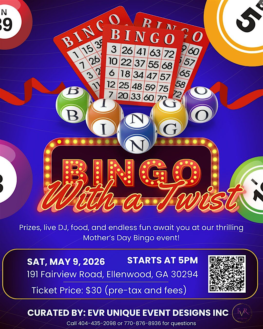 Come join us for a fun-filled afternoon of Bingo like you've never seen before! Our Mother's Day Bingo with a Twist event is happening at 191 Fairview Rd, Ellenwood, GA 30294 (old Southern Crescent Pediatrics building). Bring your mom, grandma, daughters, or any special lady in your life for a chance to win exciting prizes and enjoy some quality time together. Don't miss out on this unique twist on a classic game. See you there!