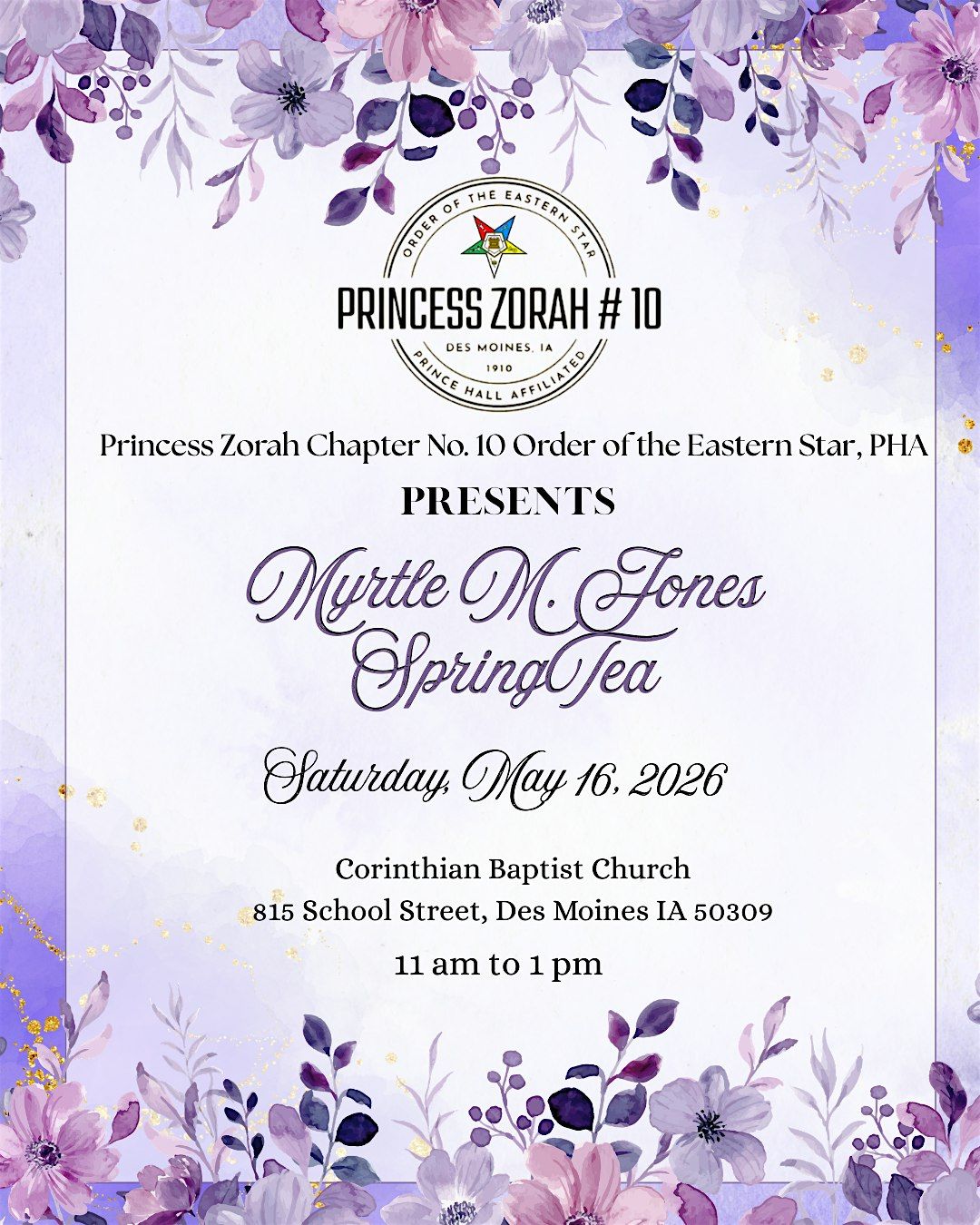 We invite you to join us for our Annual Myrtle M. Jones Spring Tea hosted by Princess Zorah Chapter No. 10, Order of the Eastern Star, Prince Hall Affliated, State of Iowa and Jurisdiction Inc.