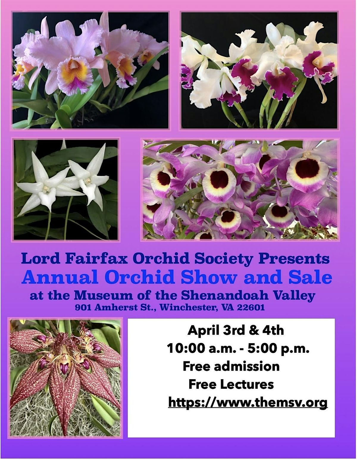 Learn how to grow orchids from the experts of the Lord Fairfax Orchid Society! Three lectures will be offered every day!
