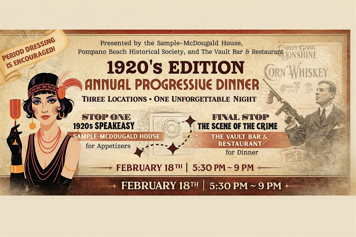 Step back in time for a 1920s Edition Annual Progressive Dinner, an immersive evening of history, dining, and vintage glamour. Guests will journey to three iconic locations—the Sample-McDougald House, Pompano Beach Historical Society, and The Vault Bar & Restaurant—enjoying appetizers, dinner, and dessert along the way. Inspired by speakeasies and true crime tales of the era, the night blends storytelling, atmosphere, and indulgent cuisine. Period attire is encouraged for a truly unforgettable Roaring Twenties experience.